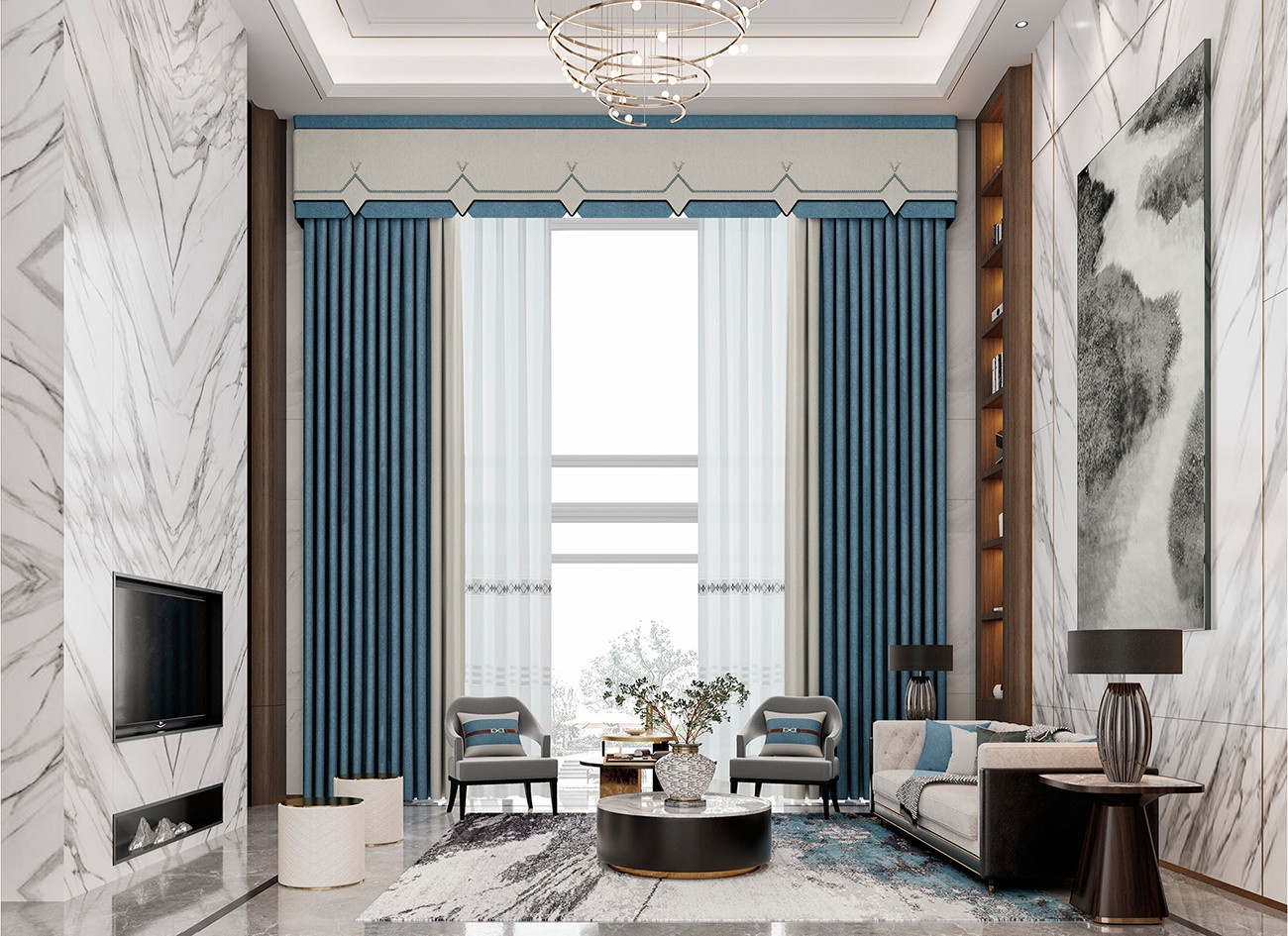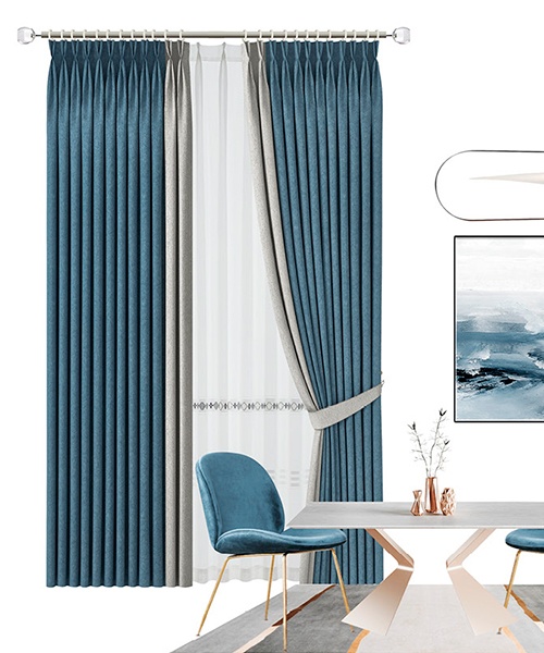 通過線條變化強調視覺差異,構建出窗簾的視線落點,代爾夫特藍增加整個居室的質感