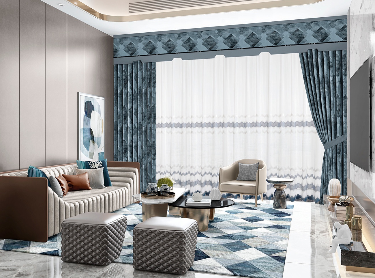 灰藍色承載了灰色的沉靜高貴、藍色的優雅氣質,讓空間更具穿透力,簾身錯落有致的幾何圖案鋪陳簾身,賦予空間輕奢﹑雅致而舒適的生活氛圍。