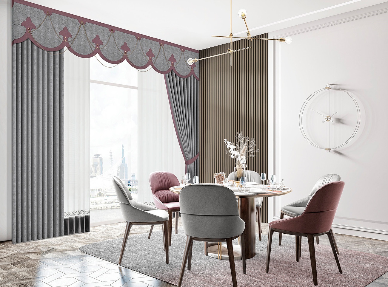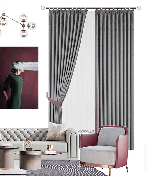 自帶紋理的莊重煙灰色仿佛是中世紀古堡中歷經歲月的大理石,赭石色的鳶尾花圖案延續著色彩帶來的優雅體驗,流暢的弧形簾頭訴說著古典美學的魅力。別出心裁的金色鏈飾更彰顯著歐洲皇室般的高貴氣質,優美而不繁復,簡約而清麗。